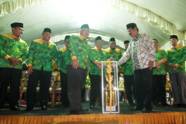 Bupati Ismunandar didampingi Wabup Kasmidi Bulang dan FKPD menyerahkan piala bergilir kepada Ketua LPTQ Irawansyah dan selanjutkan diserahkan ke Camat Teluk Pandan Amir. ©2017 Merdeka.com