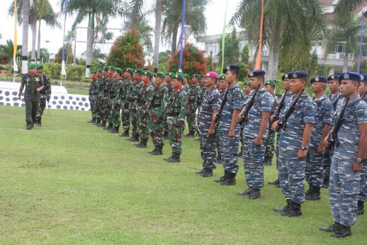 Dandim 0909/Sangatta Letkol Inf Setyo Wibowo selaku inspektur upacara memeriksa barisan saat apel upacara hari Juang Kartika di halaman kantor bupati, Kamis (15/12/2016 kemarin. ©2016 Merdeka.com
