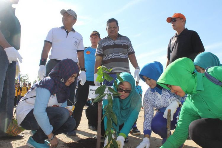 Wakil Ketua PKK Hj Tira Satriani yang juga istri Wabup Kasmidi, ikut menanam pohon di kawasan pantai Kenyamukan bersama jajaran Lanal Sangatta dan unsur lapisan masyarakat lainnya. ©2017 Merdeka.com
