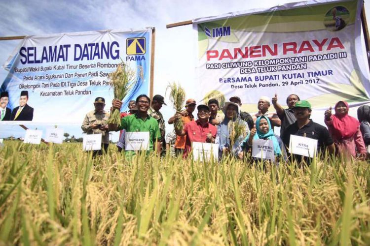 Merdeka.com, Kutai Timur - Kelompok Tani Padaidi III, Kecamatan Teluk Pandan, Kabupaten Kutai Timur, Sabtu (29/4/2017) kemarin melakukan panen raya padi yang turut dihadiri Bupati Kutim Ismunandar. Yang membanggakan, hasil panennya bisa mencapai sekitar 5,6 ton per hektare.