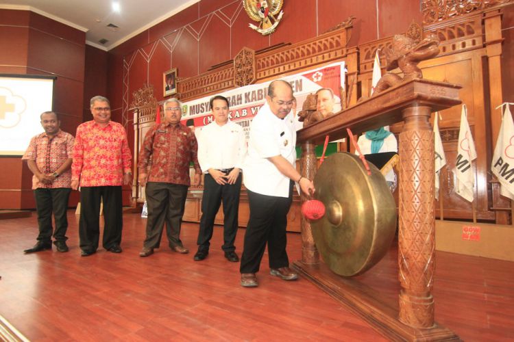 Bupati Kutim Ismunandar didampingi Seskab Irawansyah dan ketua harian PMI memukul gong sebagai tanda dibukanya Muskab PMI Kutim. ©2017 Merdeka.com