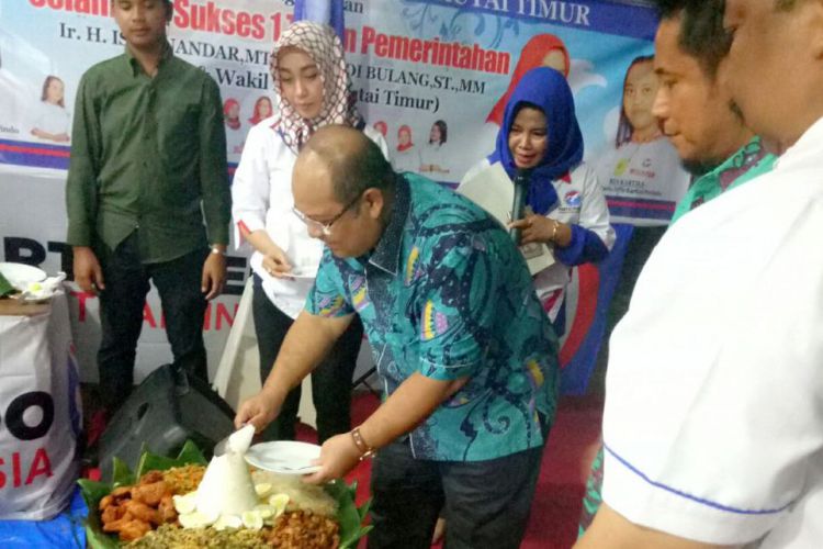 Bupati Ismunandar memotong tumpeng saat perayaan setahun kepemimpinannya disaksikan Ketua Partai Perindo Kutim Sumarno, di sekretariat partai tersebut, Jumat (17/2) malam. ©2017 Merdeka.com