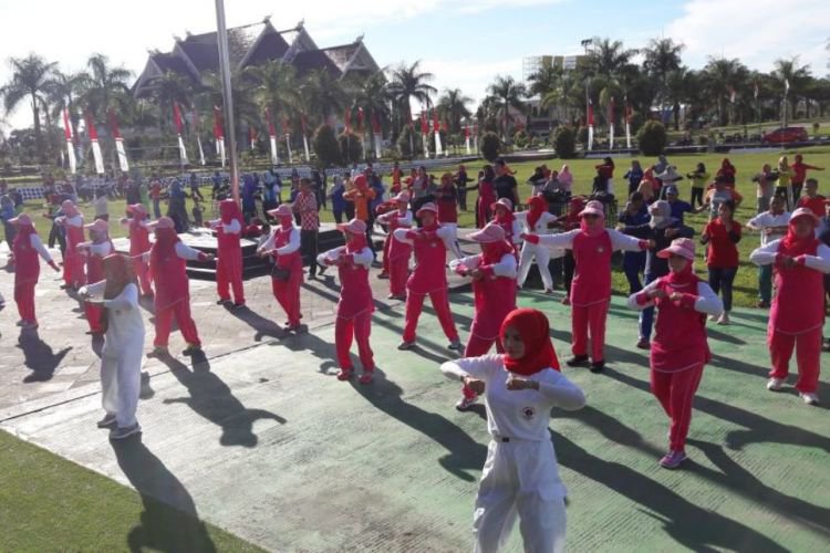 ASN lingkup Kutim dan Dharma Wanita Persatuan semangat mengikuti senam jantung sehat garapan Yayasan Jantung Indonesia (YJI) Kutim di halaman kantor bupati. ©2017 Merdeka.com
