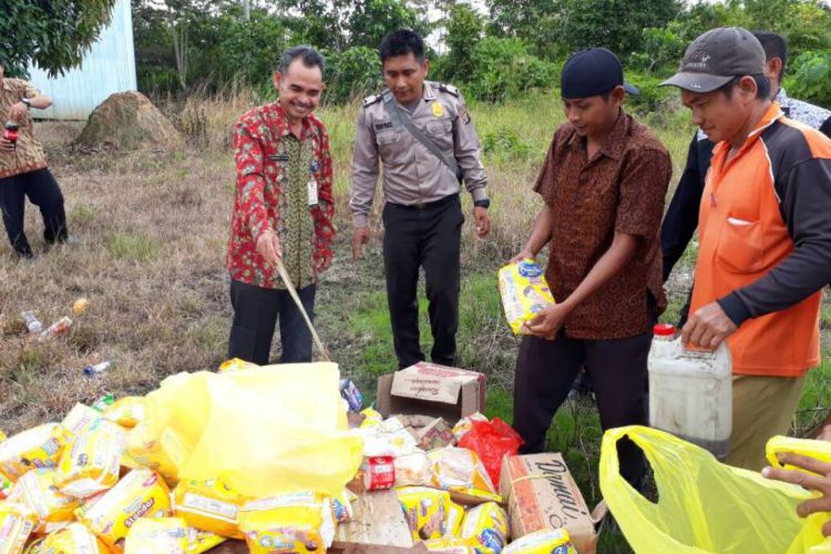 Camat Long Mesengat Darmansyah (batik kiri) bersama aparat kepolisian dan instansi terkait sedang memusnahkan barang kedaluwarsa dan kembang api yang disita hasil razia. ©2017 Merdeka.com