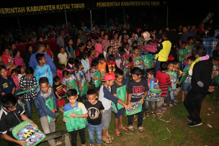 Wabup Kasmidi Bulang didampingi istrinya Ny Tirah Satriani menyerahkan bantuan berupa buku dan tas sekolah kepada warga desa Mulupan, kecamatan Muara Bengkal. ©2016 Merdeka.com