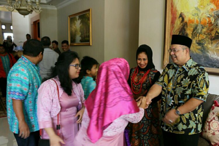 Bupati Ismunandar dan istri Hj Encek UR Firgasih serta keluarga menerima tamu saat open house di rumah pribadinya di Samarinda, ribuan warga hadir pada acara tersebut. ©2017 Merdeka.com