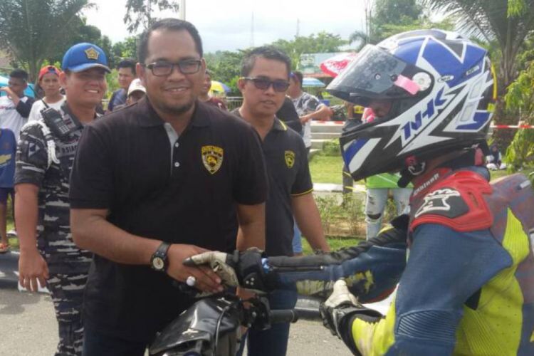 Wabup Kasmidi Bulang memberikan ucapan selamat bertanding kepada peserta usai membuka acara lomba raod race bupati Cup dan Kejurda . ©2017 Merdeka.com