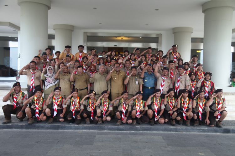 Wabup Kasmidi Bulang dan sejumlah pejabat Kutim berfoto bersama dengan pramuka yang akan ikut jambore di Cibubur. ©2016 Merdeka.com