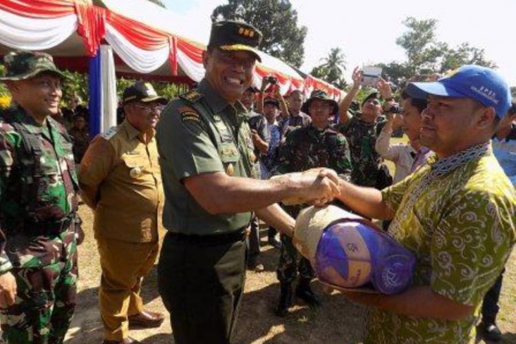 Irdam VI/Mulawarman Kol Inf Dwi Winaryo menyerahkan bantuan kepada masyarakat usai menutup kegiatan TMMD di desa Mandu Dalam, kecamatan Sangkulirang. ©2017 Merdeka.com