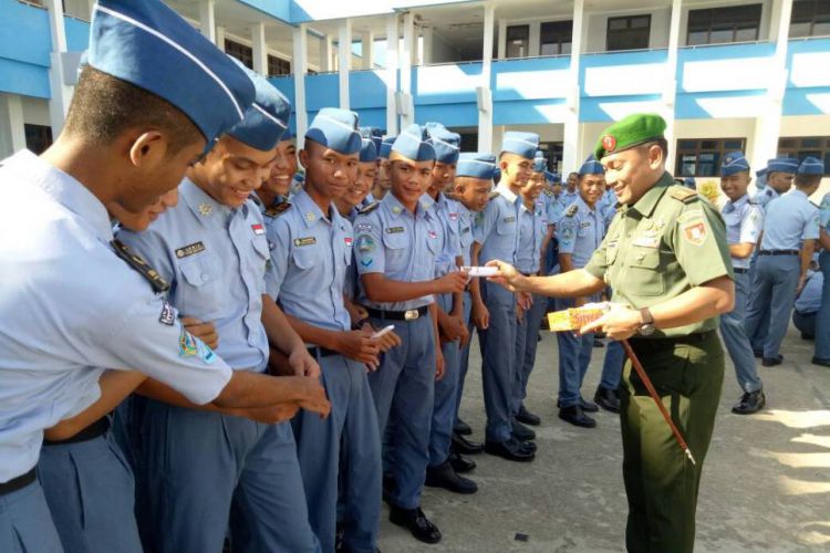 Dandim 0909/Sangatta Letkol Inf Setyo Wibowo sedang membagikan 'permen Pancasila manis' usa jadi Inspektur Upacara memperingati Harlah lahrnya Pancasilan di SMKN 2 Sangatta Utara. ©2017 Merdeka.com