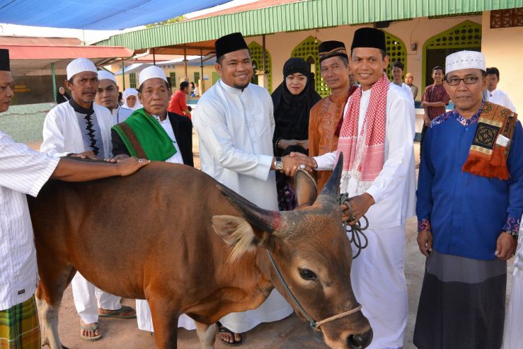 Wabup Kasmidi Bulang menyerahkan hewan kurban kepada panitia penyembelihan hewan kurban di masjid Nurut Taqwa, massabang, Sangatta Selatan, usai salat idul adha, Senin (12/9) kemarin. ©2016 Merdeka.com