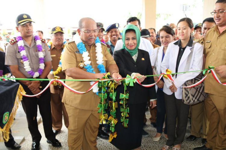 Bupati Ismunandar dan istri Hj Encek UR Firgasih menggunting pita sebagai tanda beroperasinya Rumah Sakit Pratama Sangkulirang. ©2017 Merdeka.com