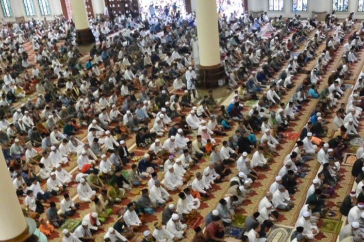Suasana sholat Idul Fitri di masjid Agung tahun lalu, masyarakat umat muslim memenuhi masjid kebanggaan masyarakat Kutim itu dan bupati Ismunandar dijadwalkan sholat Idul Fitri besok di sana. ©2017 Merdeka.com
