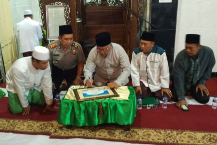 Seskab Irawansyah menandatangani plakat tentang dibukanya kuliah subuh setiap pekan di masjid Al-Anshor, jalan Durian Sangatta Utara. ©2017 Merdeka.com