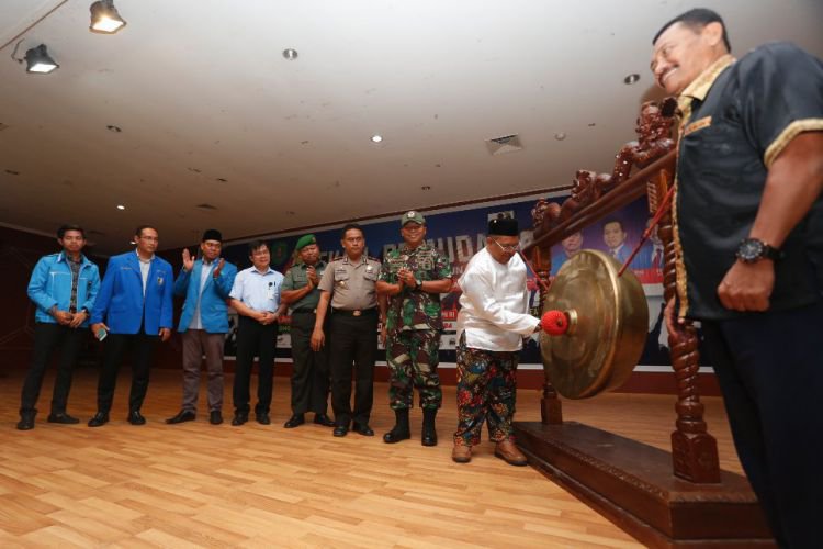 Bupati Kutim Ismunandar memukul ging sebagai tanda dimulaikan kegiatan Pekan Pemuda yang digelar KNPI Kutim di GSG, kawasan Bukit Pelangi, Sangatta Utara. ©2017 Merdeka.com