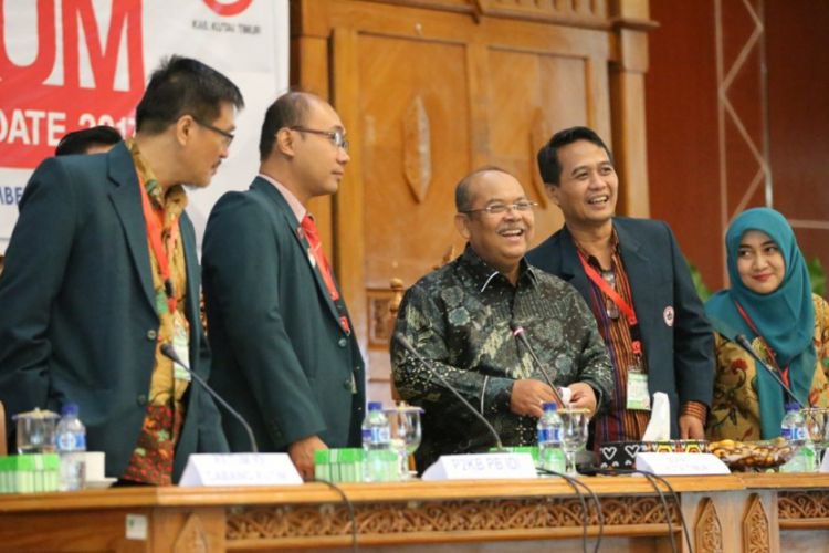 Bupati Ismunandar (baju batik) berbincang dengan pengurus IDI pusat dan Kutim serta panitia, usai membuka acara simposium dan musda IDI Kutim di ruang Meranti . ©2017 Merdeka.com