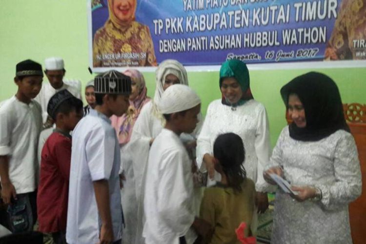 Ketua TP PKK Kutim Hj Encek UR Firgasih didampingi Camat Sangatta Selatan membagikan santunan kepada anak yatim di panti asuhan Hubbul Wathon, Sangatta Selatan. ©2017 Merdeka.com