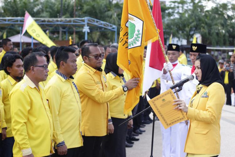 Ketua DPD Golkar Kaltim Rita Widyasari ketika melantik Ketua DPD Golkar Kutim Kasmidi Bulang dan pengurus lainnya di ruang terbuka yang 'dikawal' ribuan kadernya. ©2017 Merdeka.com