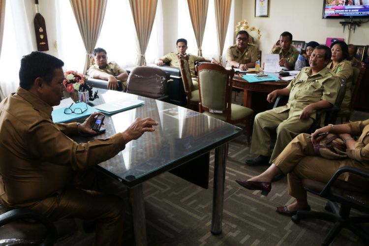 Asisten pemerintahan umum dan kesra Mugeni ketika memimpin rapat koordinasi dengan dinas instansi terkait di ruang kerjanya membahas masalah asuransi kesehatan bagi warga miskisn di Kutim. ©2017 Merdeka.com