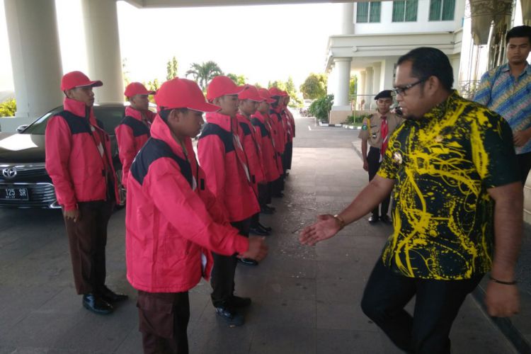 Wabup Kasmidi Bulang ketika melepas kontingen pramuka Kutim untuk ikut event kemah Garda Museum di Sanga-sanga. ©2017 Merdeka.com