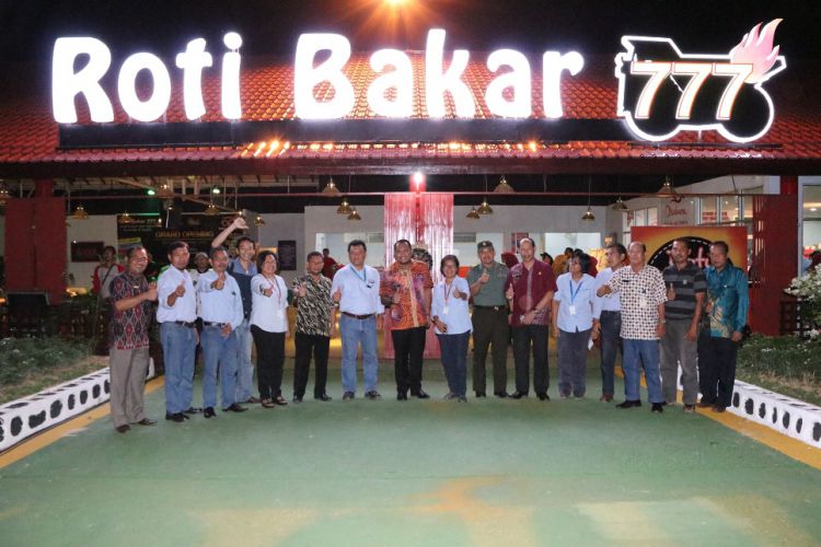 Wabup Kasmidi Bulang berfoto bersama dengan manajemen KPC dan tamu undangan di depan gerai roti bakar 777, usai meresmikannya. ©2016 Merdeka.com