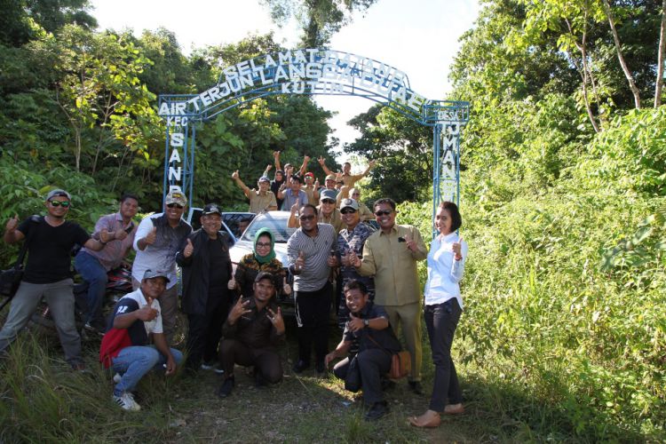 Rombongan Bupati Ismunandar, Wabup Kasmidi Bulang dan Wakil Ketua DPRD Hj Encek UR Firgasih foto bersama di pintu gerbang air terjun Tanjung Mangkalihat. ©2017 Merdeka.com
