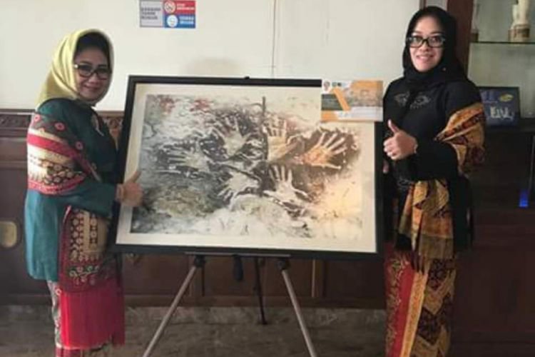 istri bupati Hj Encek UR Firgasih dan istri wabup Hj Tira Satriani, kompak foto bersama pada gambar cadas yang ada di kantor Bupati untuk mempromosikan wisata Kutim. ©2017 Merdeka.com