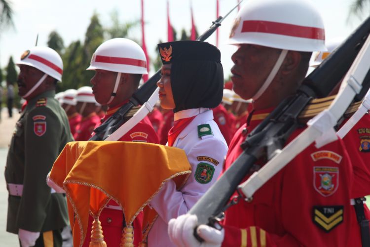 Merdeka.com, Kutai Timur - Putra Putri terbaik Kabupaten Kutai Timur (Kutim) tampil sebagai Pasukan Pengibar Duplikat Bendera Pusaka (Paskibraka) tinggkat Kutim pada pengibaran duplikat bendera pusaka negara Republik Indonesia (RI) di halaman Kantor Bupati Kutim rabu, (17/8).