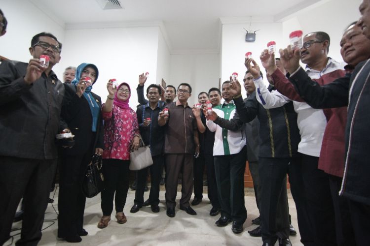 Ketua DPRD Kutim Mahyunadi dan anggota dewan lainnya menunjukkan air urine yang mau dilakukan tes oleh BNN Kutim dan diikuti seluruh staf sekretariat DPRD setempat, sebagai salah satu upaya bentuk memerangi narkoba. ©2016 Merdeka.com