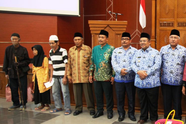 Supandi, berdiri paling kiri bertongkat foto bersama dengan rekan lansia dan Bupati Ismunandar, Plt Kadis Sosial dan Seskab Irawansyah usai menerima bantuan sembako . ©2017 Merdeka.com