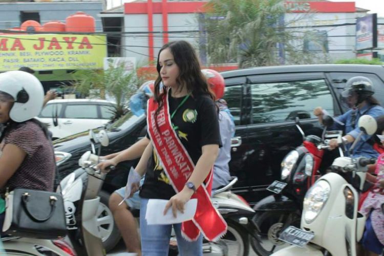 Duta Pariwisata Kutim ikut berpartisipasi mensukseskan pesta adat pelas tahun dan pesona budaya Kutai Timur, dengan menyebarkan brosur di jalanan . ©2016 Merdeka.com