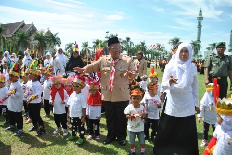 Merdeka.com, Kutai Timur - Ada yang menarik dari peringatan Hari Pramuka ke 55 tingkat Kabupaten Kutai Timur (Kutim), Senin (15/8/16) lalu. Yaitu saat anak-anak beserta pendidik dari PAUD/HIMPAUDI menampilkan tarian tematik Gemu Famire, yakni tarian yang sering dilakukan oleh adik-adik Pramuka. Tanpa canggung Bupati Kutai Timur Ir H Ismunandar MT diikuti jajaran Satuan Perangkat Kerja Daerah (SKPD), Unsur Forum Koordinasi Pimpinan Daerah dan legislatif turun langsung dari panggung utama untuk ikut menari bersama.