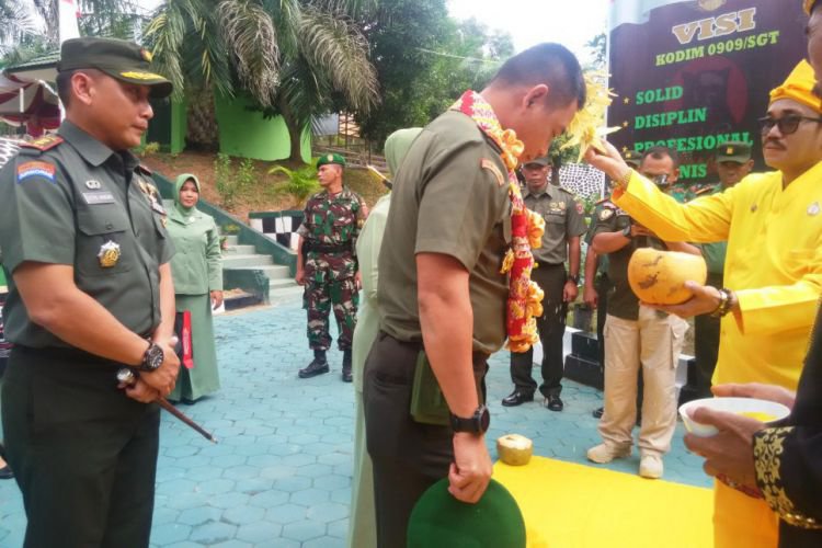 Danem 091/ASN diberikan sambutan dengan tepong tawar dengan adat Kutai saat tiba di Makodim 0909 Sangatta disaksikan Damdim 0909/Sangatta Letkol Setyo Wibowo. ©2017 Merdeka.com