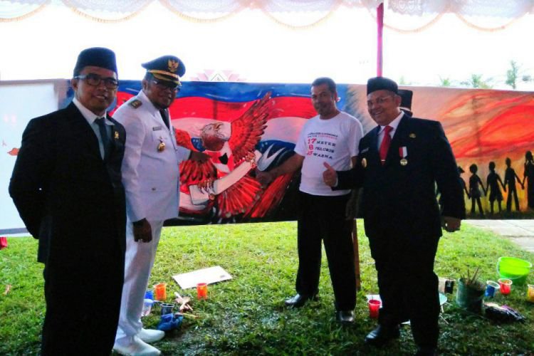 Bupati Ismunandar, Wabup Kasmidi Bulang dan Ketua DPRD Mahyunadi serta pelukis foto bareng dengan latar belakang lukisan 17 meter. ©2017 Merdeka.com