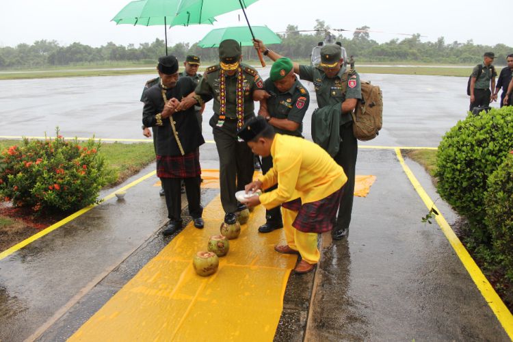 Pangdam VI Mulawarman Mayjen Jhoni mendapat sambutan adat tepong tawar Kutai di Bandara Tanjung Bara, Sangatta. ©2016 Merdeka.com