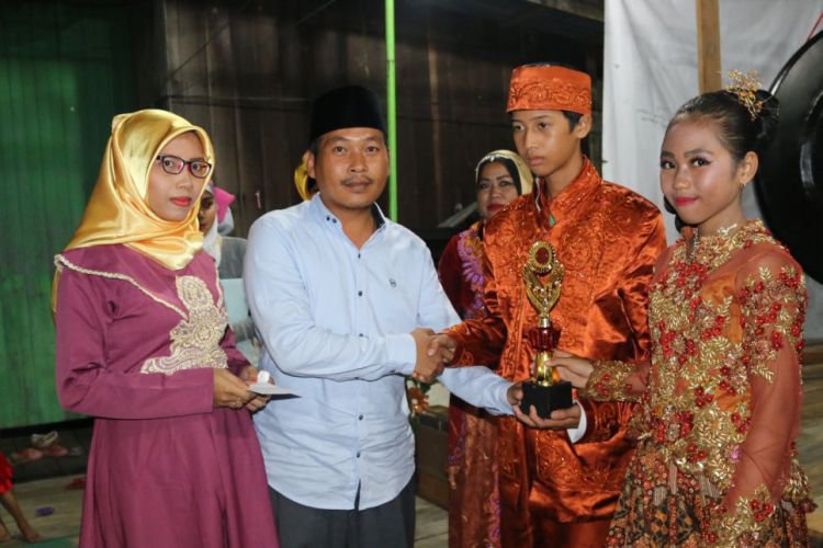 Kades Tepian Langsat Zakey ketika menyerahkan hadiah dan piala kepada pemenang lomba seni di desanya dalam rangka memperingati hari sumpah pemuda. ©2017 Merdeka.com